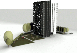 V pritličju so prav tako (na strani proti igriščem) predvidena stanovanja, v osrednjem delu in pod vzhodno lamelo pa servisni prostori. V pritličju bodo na severni in vzhodni strani zunanja parkirna mesta, delno pod objektom. Skupaj jih je predvideno 20. V kleteh so predvidene garaže s skupno 169 parkirnimi mesti ter tehničnimi prostori in ustreznim številom stanovanjskih shramb. Vhod v klet (rampa) v klet je na južni strani zemljišča in tako deli območje stanovanjske stolpnice od študentskih domov. Zunanja ureditev okoli stolpnice je zasnovana tako, da bo na zahodni strani večja zelenico in urejena igrišča. Proti pro metnim površinam bo izvedena protihrupno ograjo. Tudi sicer bo dvorišče stolpnice ograjeno. |